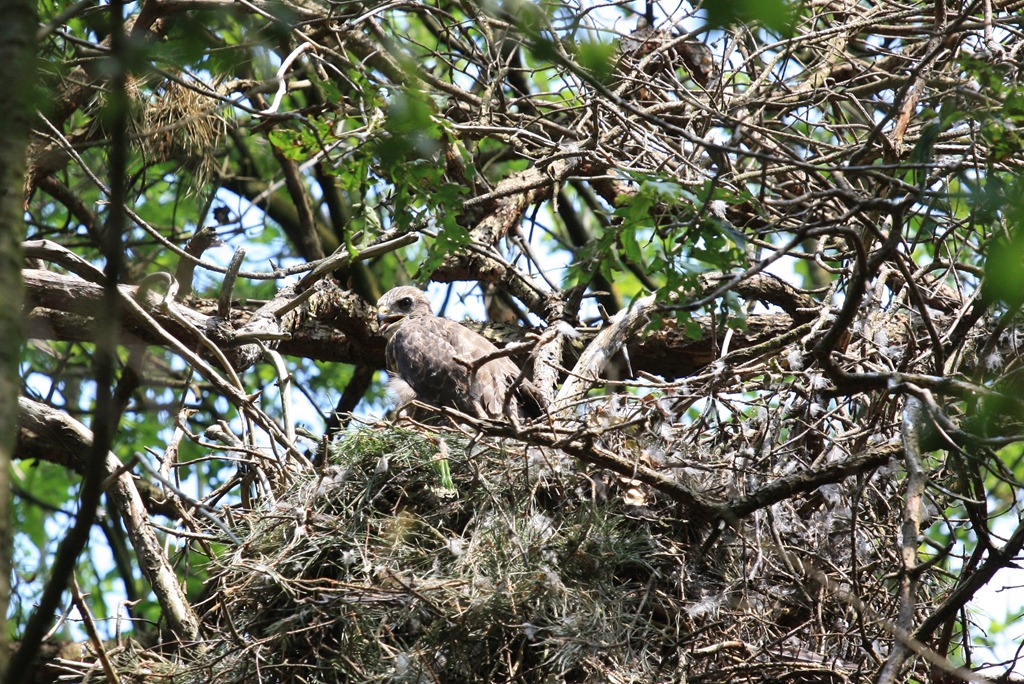 We’re having a heatwave at the moment (temperatures are around the 30 oC mark). This young buzzard waiting on the nest in the nearby wood is feeling the heat…