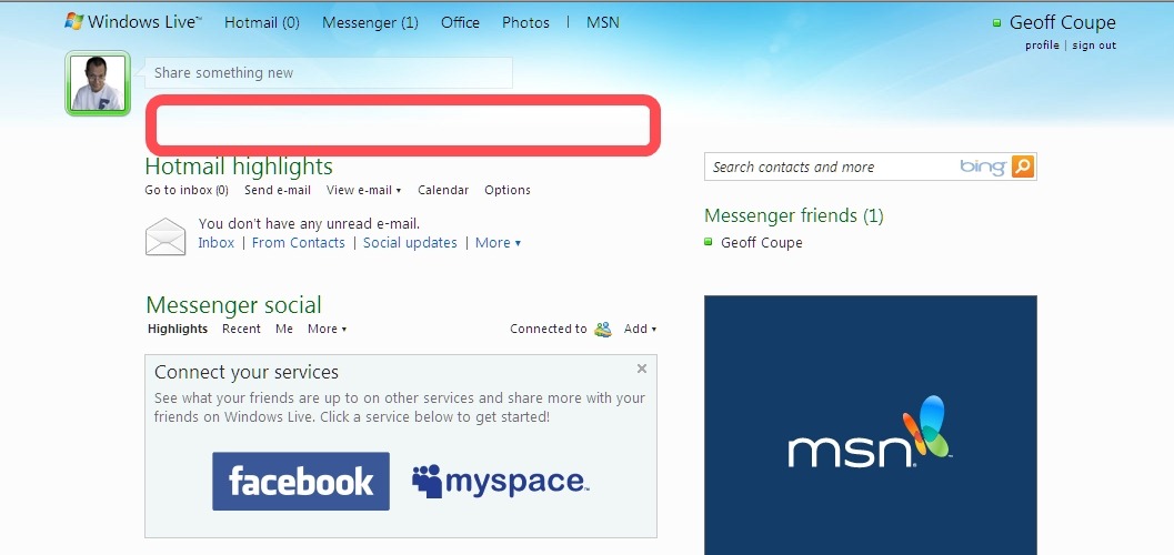 I used to be able to see upcoming events in my Calendar, my local weather, and if I had private message in my Windows Live messaging inbox. That has all gone. The red outline in the following screenshot shows where they used to be…