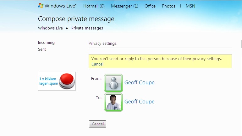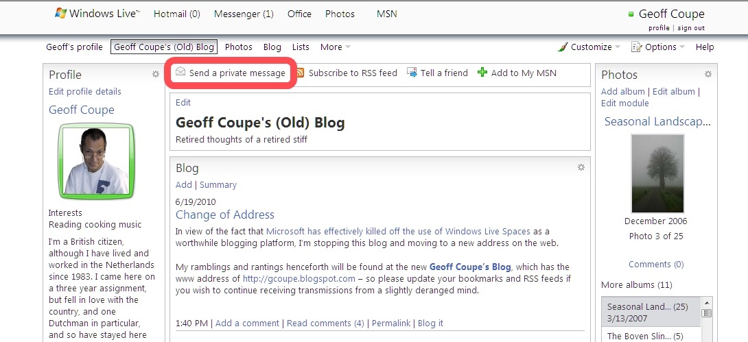 I spent a long while trying to find out where my Windows Live Message inbox and sent messages have gone. I eventually discovered that the only way to access the system was to fake a message by clicking on the “Send a private message” button in my Windows Live Space (see below).