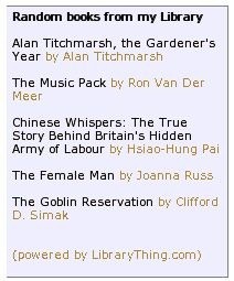 Option (1) means that I lose my dynamic LibraryThing widget that displays a rolling selection of books from my library (see image 1) and instead have a static, textual selection that only gets refreshed when the whole web page is refreshed (image 2). On the plus side, I get access to a better statistics feature that keeps me informed as to how my blog is being read.