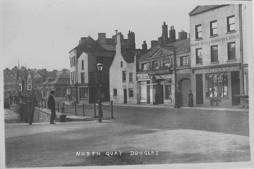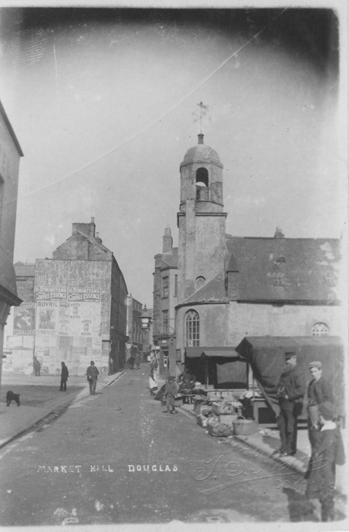 Douglas harbour has seen great changes. I couldn’t find a series of photos taken from the same viewpoint, but here are some that illustrate something of what has gone on in the last 150 years. The first shows Market Hill, the street leading up from the quay. The old St. Matthew’s church is the focus of the picture, with the old open-air market just shown on the right.