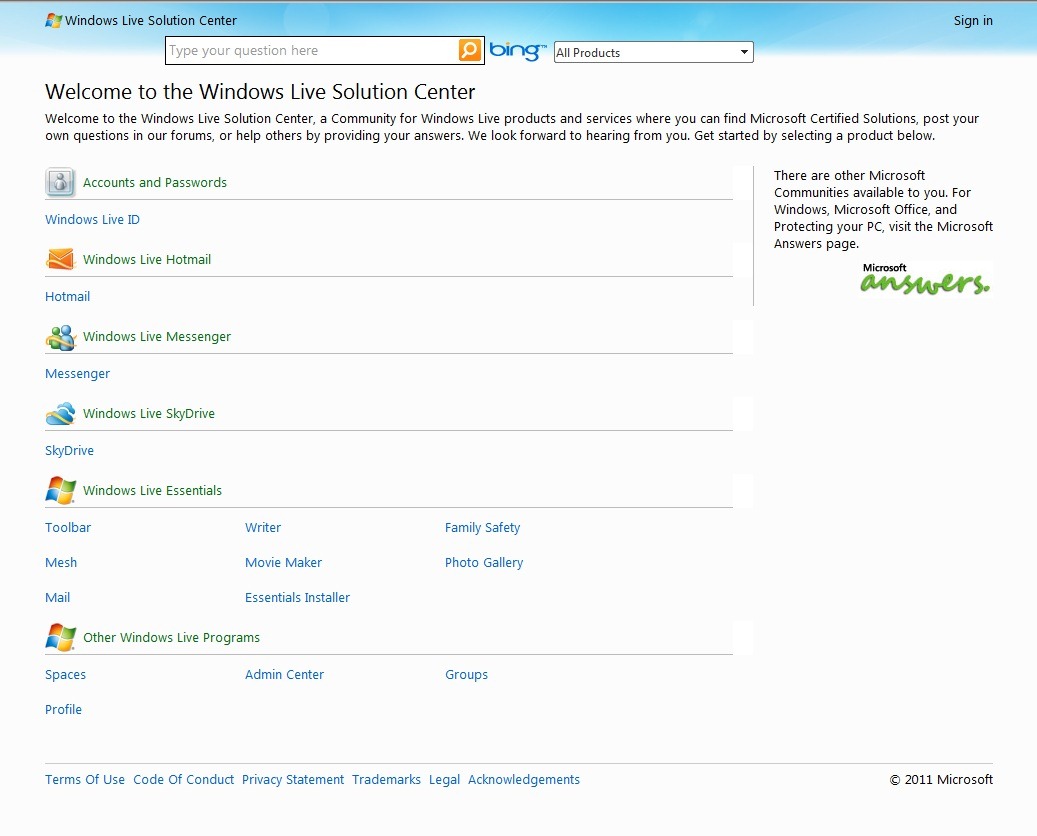 …there’s no reference whatsoever to either the Windows Experts Community or Windows Live Solution Center. And over on the home page of the Windows Live Solutions Center, there’s a link to Microsoft Answers, but no mention of the Windows Experts Community, even though the latter has forums dedicated to Windows Live products!