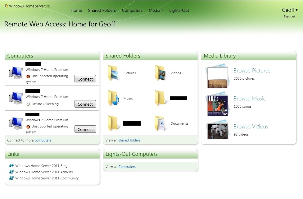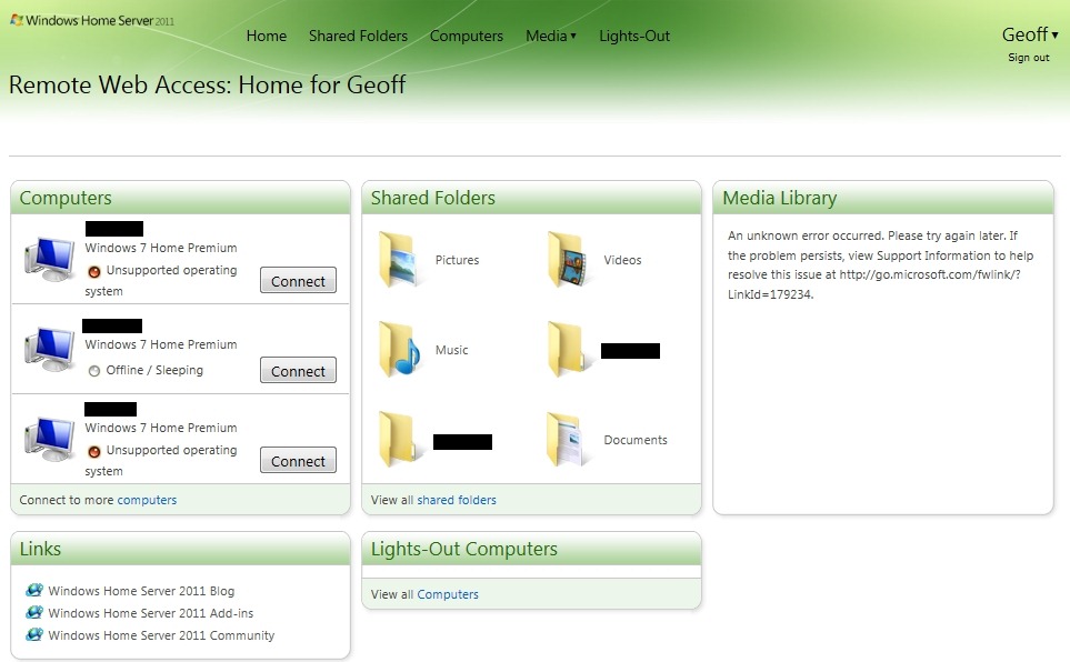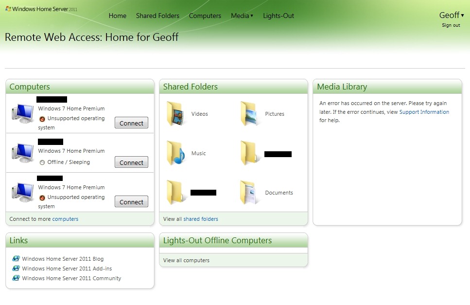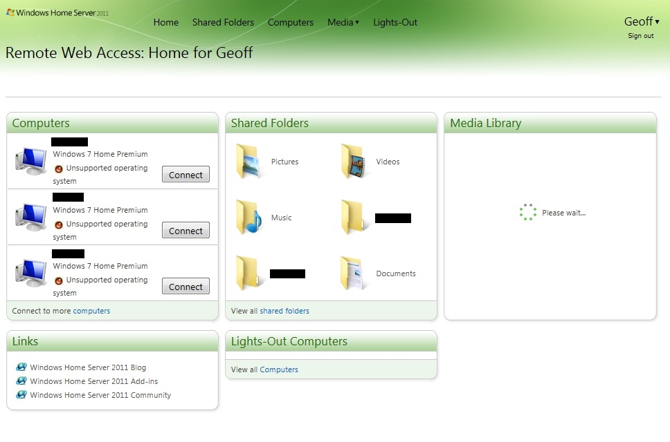 When I use Remote Web Access to look at my server, after I sign in with my userid and password, Iβm presented with the home screen of my WHS 2011 server. As you can see, the attached computers and shared folders are seen at once, but the view of the Media Library is still being built.