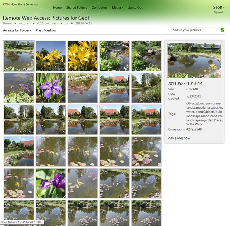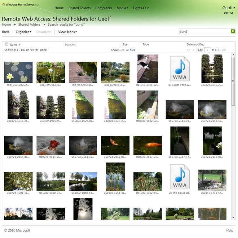 Oh, and remember that I said that the Media Library would display the tags contained in photos, even if you couldnβt search on them? Well, the Shared Folders wonβt display any tags in photos (thereβs no equivalent of the βFile propertiesβ view in Remote Web Access), but you can search on tagsβ¦ Honestly, is this experience designed, or did it just grow, like Topsy?