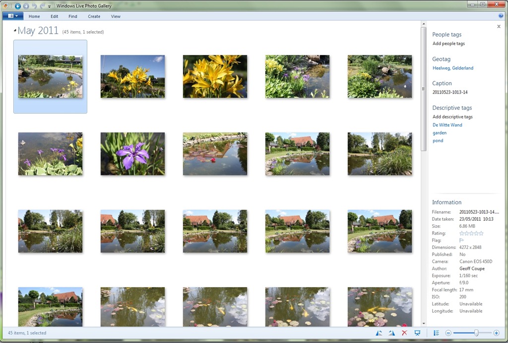 By the way, notice how the βDate createdβ field in the above screenshot is using the US format (mm/dd/yyyy), despite the fact that the format setting on my server has been set to the European format (dd/mm/yyyy). Furthermore, is this field the date the file was created, or the date the picture was taken? βDate createdβ is NOT necessarily the same as βDate takenβ for digital pictures. Windows Live Photo Gallery 2011 recognises this, and displays the βDate takenβ field (see screenshot below). The Media Library in WHS 2011 is either displaying a different field or using the wrong metadata name. More inconsistency in the user experience, it would seem.