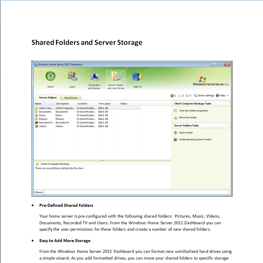 Your home server is pre-configured with the following shared folders: Pictures, Music, Videos, Documents, Recorded TV and Users. From the Windows Home Server 2011 Dashboard you can specify the user permissions for these folders and create a number of new shared folders.