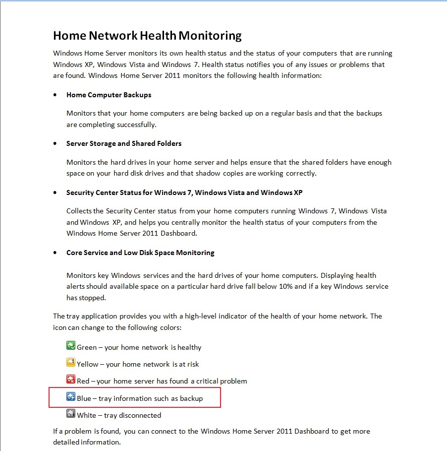 Addendum 5th July 2011: I was browsing through the excellent We Got Served forums today, and noticed that someone had reported that the WHS 2011 notification icon in the Windows System Tray wasn’t turning blue when a backup of the PC was in progress. This was always the case in WHS v1, so I was surprised to read that it wasn’t apparently working in WHS 2011. It’s even mentioned in the Getting Started documentation: