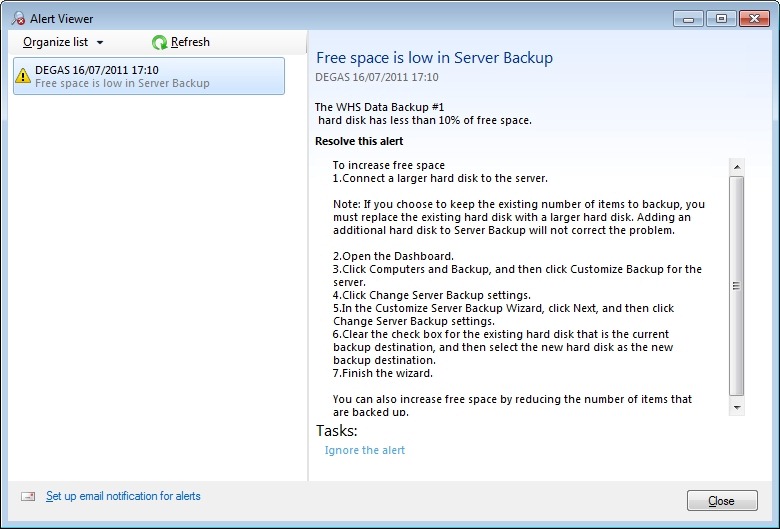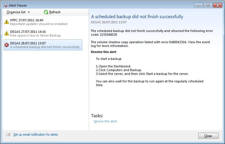 I love the way that this message simply tosses out the fact that we should view the event log for more information. I think that most Home Users presented with this message would simply think: WTF is the Event log? And they can’t view the Event log via the WHS 2011 Dashboard anyway – you have to be sufficiently IT-savvy to be able to open up a Remote Desktop Connection and then start up the Event Viewer on the server.