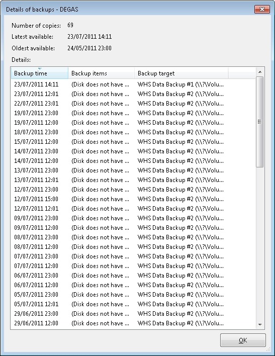 In other words, all the backups taken to drive #1 that were deleted in order to make room for today’s backup have also now been removed from this list. Up until this point, they would have been shown. I would argue that this list is a more accurate reflection of the actual situation than the list shown in the WHS 2011 Dashboard information.