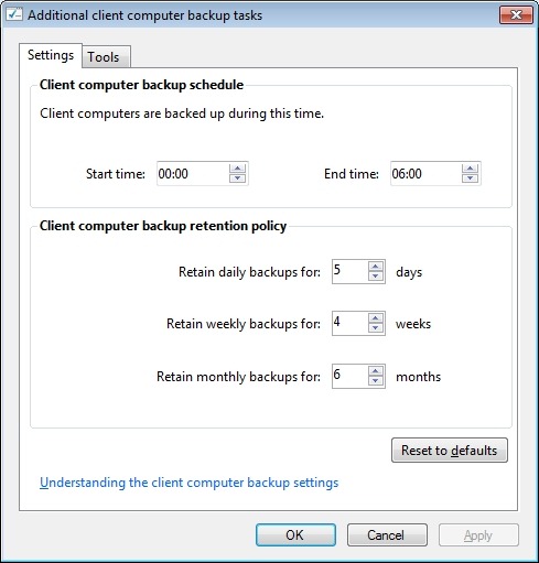 It is possible to define a retention policy for client computer backups (that is, how long the client computer backups will be kept before they are deleted and the space reclaimed for newer backups). See the following screenshot showing how the retention policy can be defined.