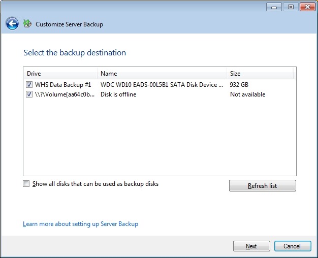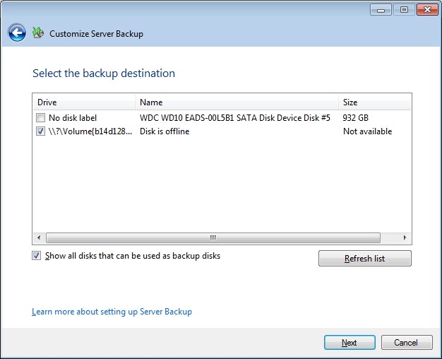 Let’s try and add it back into the Server Backup schedule… I start the Customize Server Backup wizard and reach the “select the backup destination” screen. At first, I didn’t see the backup drive, only after I checked the “Show all disks that can be used as backup disks” did it appear as the first item in this screenshot: