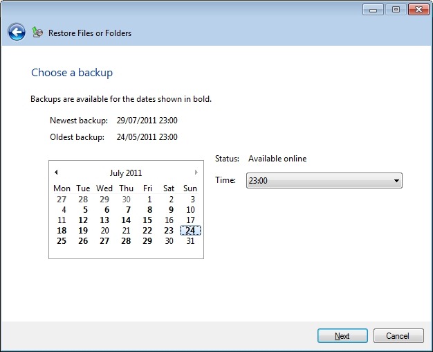 I hurriedly put in backup drive #1, and start the Server Restore wizard again. This time, I get further, and elect to choose the backup I want to restore from. If I choose a backup that was taken onto backup drive #1 (the one that’s currently plugged into the system), I get confirmation that the backup is online and available (in this case, the backup of 24th July at 23:00):