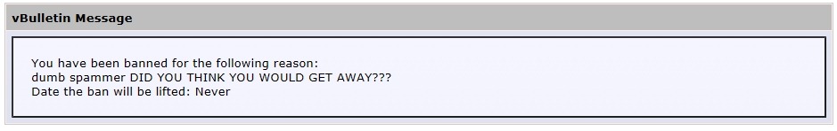 dumb spammer DID YOU THINK YOU WOULD GET AWAY???Date the ban will be lifted: Never
