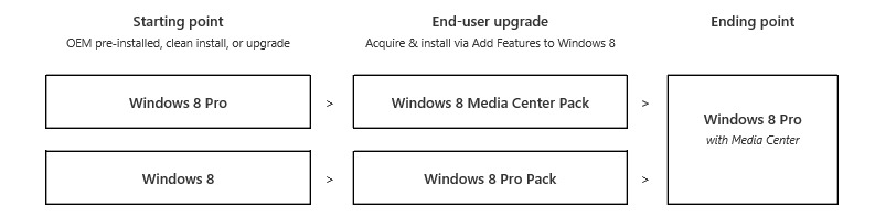 The post contains a diagram showing the possible upgrade paths to a version of Windows 8 that will contain Windows Media Center: