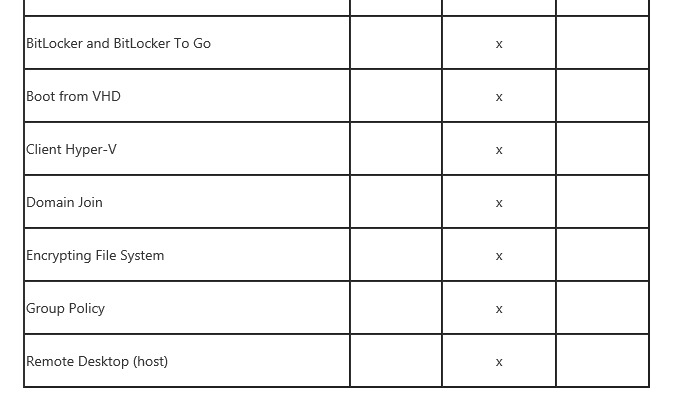 So, let me understand this. Let’s look at the starting points; you have a choice between plain old Windows 8 or Windows 8 Pro. The difference between these two features was defined in Microsoft’s original announcement of the Windows 8 versions. Here’s a part of the Features Table from that post showing the seven additional features that are included in Windows 8 Pro: