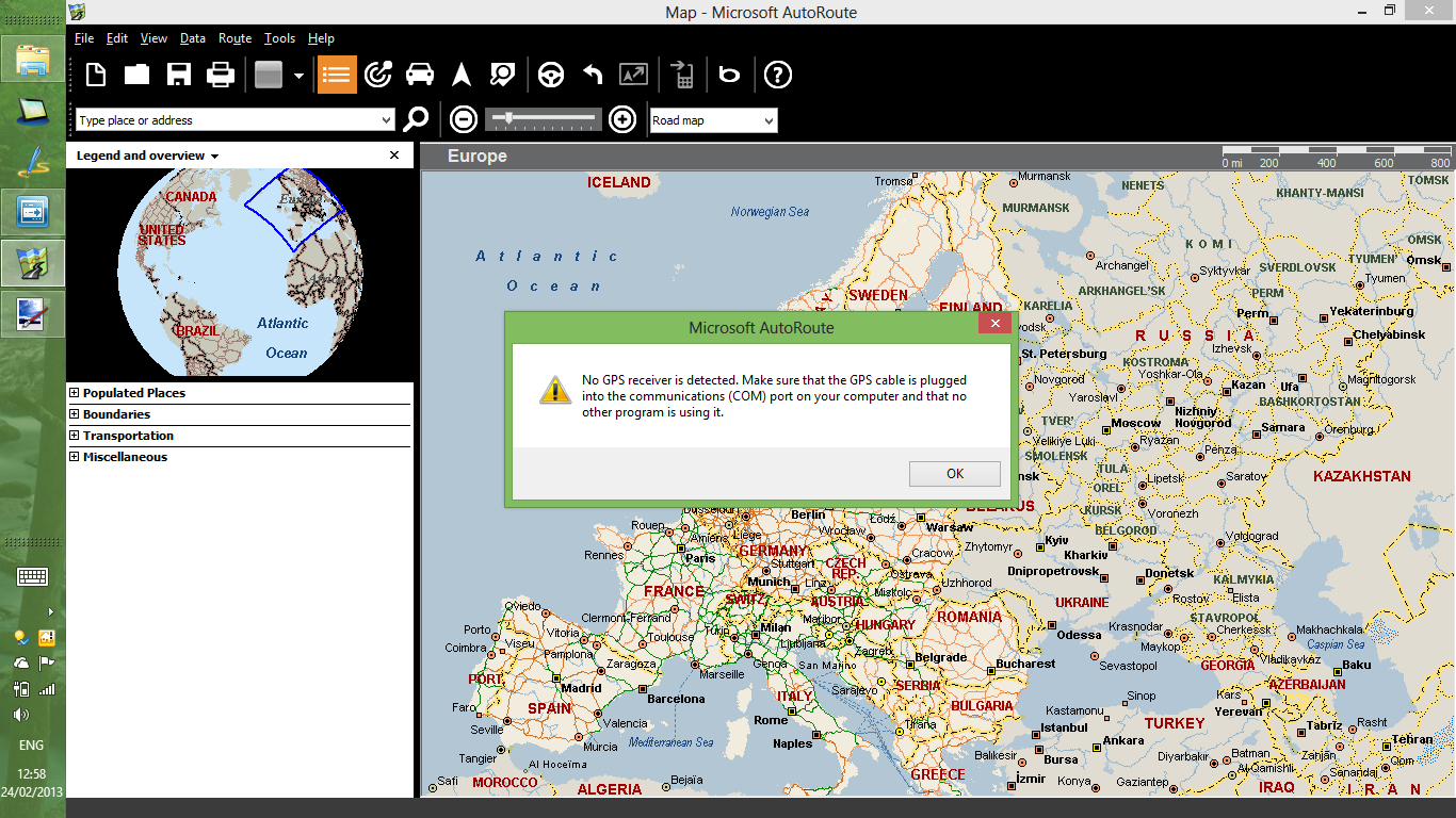 And so it is. Here for example is the very latest version of Microsoft’s AutoRoute 2013. I downloaded a trial version and installed it on my Lenovo ThinkPad Tablet 2, which has a Broadcom GNSS Gelocation Sensor in it. As you can see, AutoRoute 2013 expects to find GPS data arriving via a COM port, and complains that it can’t find the GPS receiver: