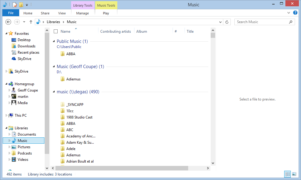 Note that one is a network location (\\degas\music – my main music collection), while the other two are local to the Windows 8.1 system; a location on the C: drive (C:\Users\Public\Music) and a location on the D: drive (called “Music (Geoff Coupe)”, but shown in the Xbox Music App with the user-friendly name of D:\6aa39937a982345b-Music… sigh). That location on the D: drive was set up by Windows 8.1 as the default location for saving music files.