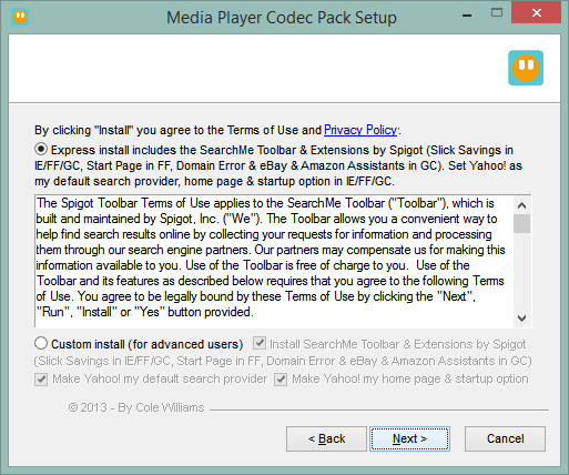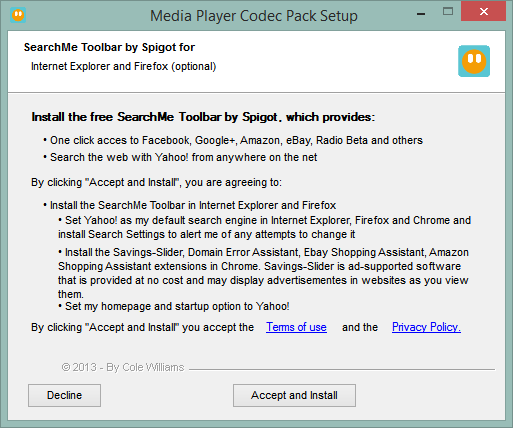 Even I have to be constantly on my guard that I’m not inadvertently letting something else in along for the ride when downloading and installing software. The latest example is the set of codecs that I use to handle media. I’ve been using the Media Player Codec Pack. The previous version (4.2.9) attempted to persuade me to install some crapware along with the codec pack. Fortunately, the Accept/Decline choice was straightforward.
