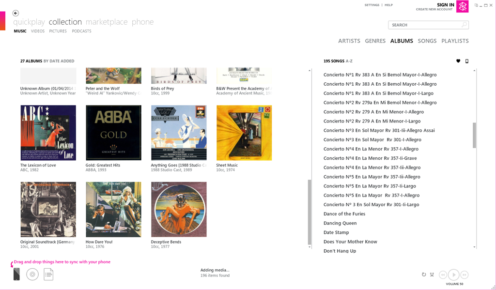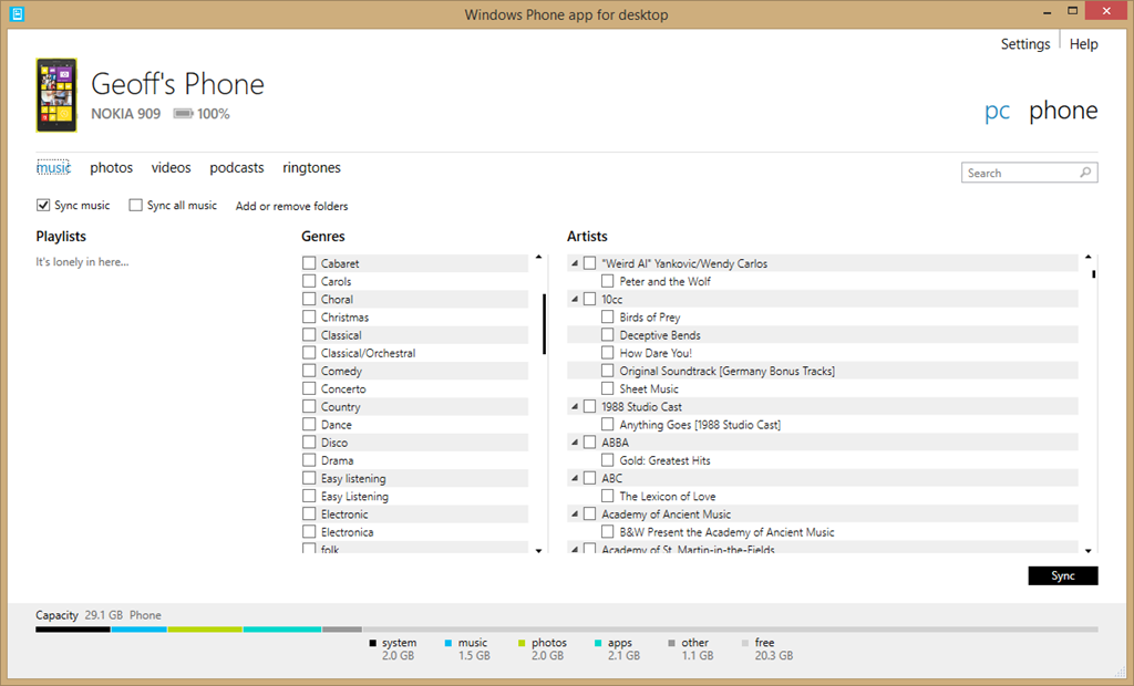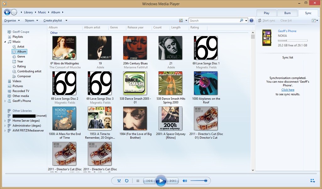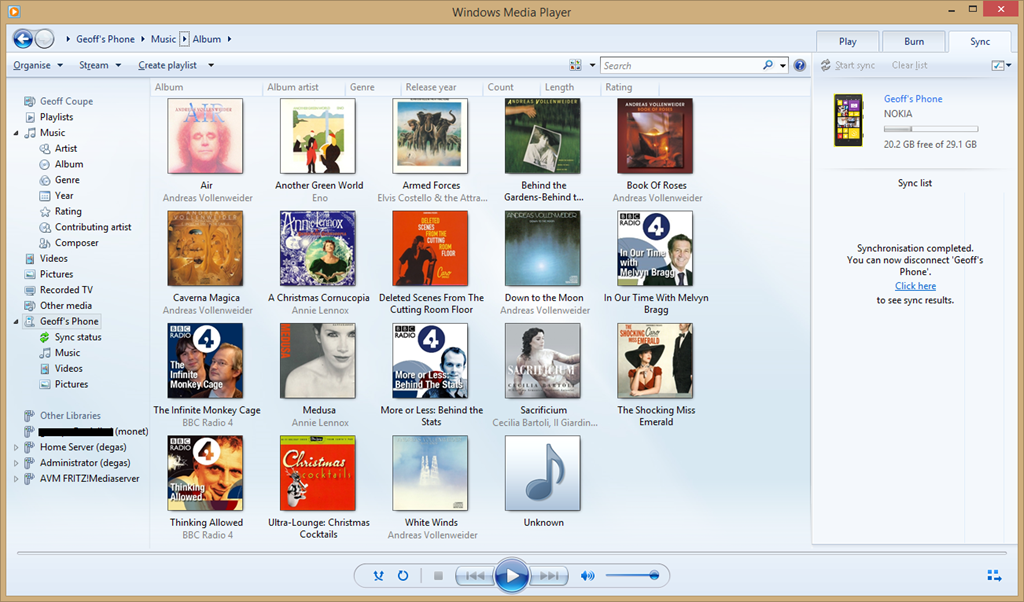 Fortunately, I have discovered that there is another alternative; and that is Microsoft’s good old Windows Media Player. It knows about Windows Phone 8 devices, and can sync to them with ease. I can display my music collection by Album, Artist, Genre, Rating, even by Composer (none of the other Microsoft applications can do this), and sync my selection to my phone with ease.