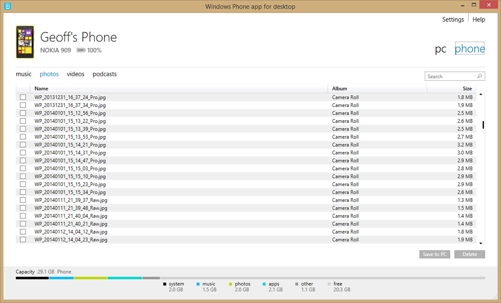 You can also use it to browse the content of your Windows Phone and manage your media on the phone if you so wish. Here’s the Album view: