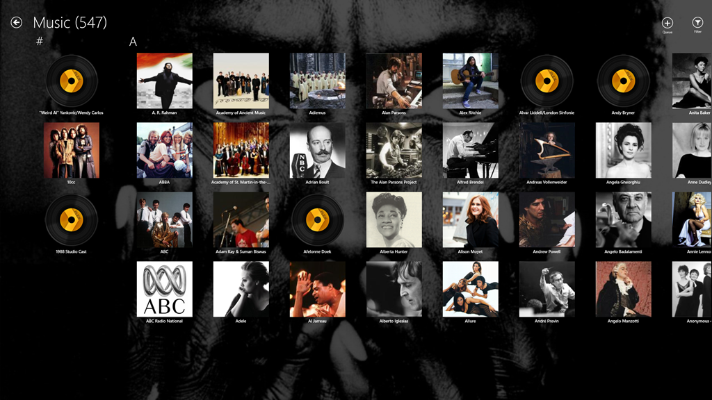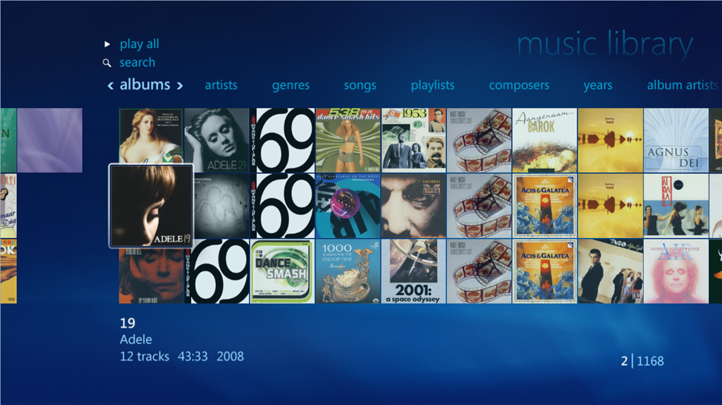 At least the MediaBrowser Windows 8.1 client offers a choice of being able to browse by Artist, Album or Genre, while the Windows Phone client adds the choice of being able to browse by song as well. However, this is nothing compared to Windows Media Center, which, since 2004 (ten years ago!), has offered a choice of being able to browse by Album, Artist (both per track and per Album), Genre, Song, Playlist, Composer, and Year:
