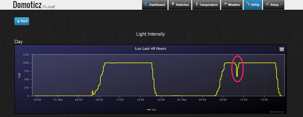 Therefore, even though I was not able to observe the eclipse directly, I certainly had indirect evidence that something was afoot. In addition, one of our outside motion sensors (part of our Home Automation installation) has a light sensor. The readings from that today clearly show how the light from the sun was obscured during the moon’s transit: