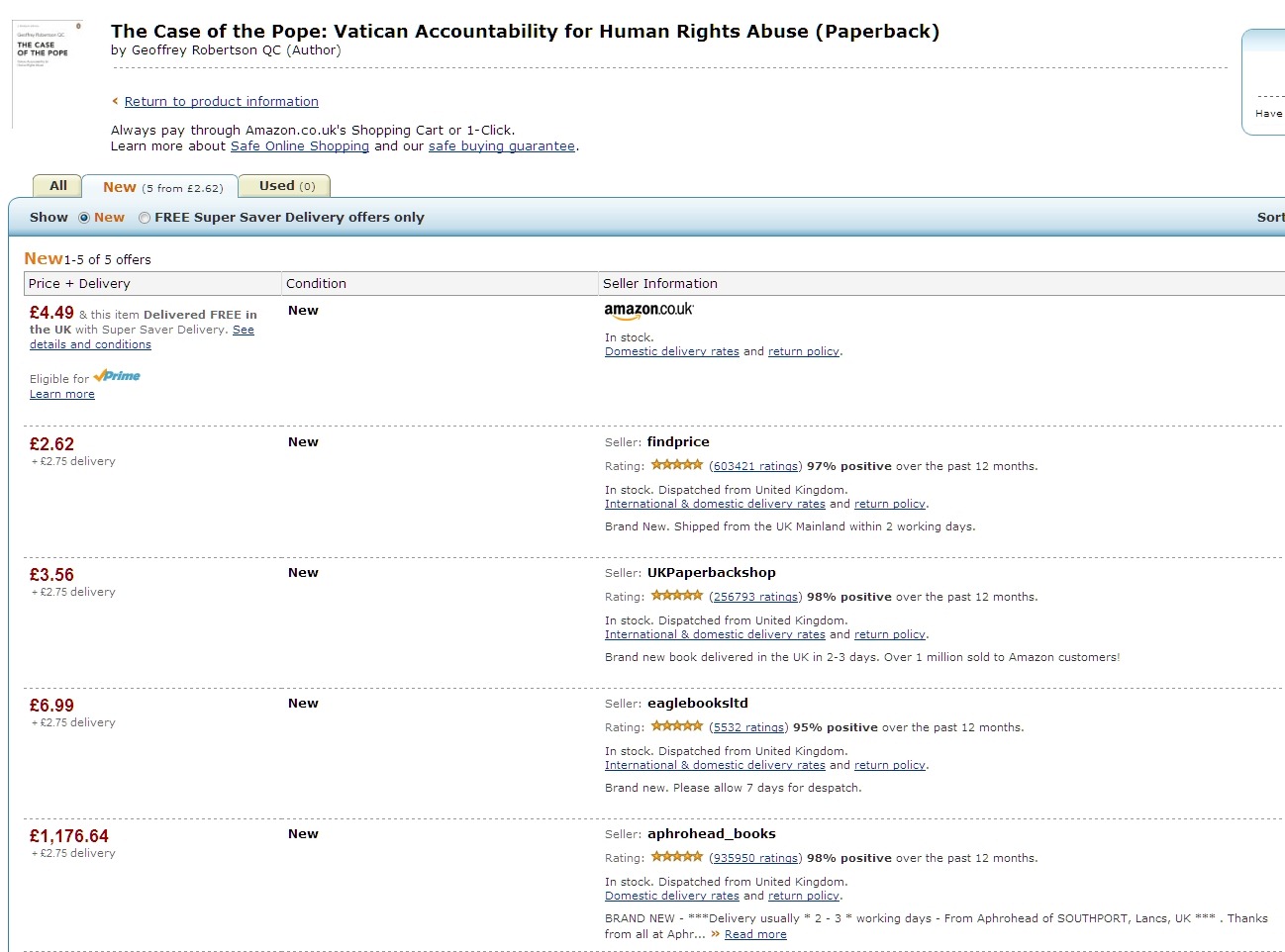 I thought that I’d invest in a copy of Geoffrey Robertson QC’s new book The Case of the Pope: Vatican Accountability for Human Rights Abuse. I see that Amazon UK have it listed for £4.49. Not bad, but I always check out Amazon Marketplace in the hope of a better deal.