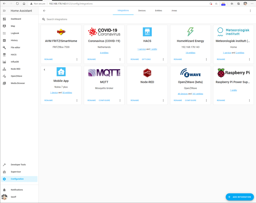 On this screen, I added the necessary integrations. For the support of Z-Wave, I had added the OpenZwave (beta) and the MQTT (the Mosquitto message broker) integrations. This screenshot shows them added, along with some other integration modules that I have added.