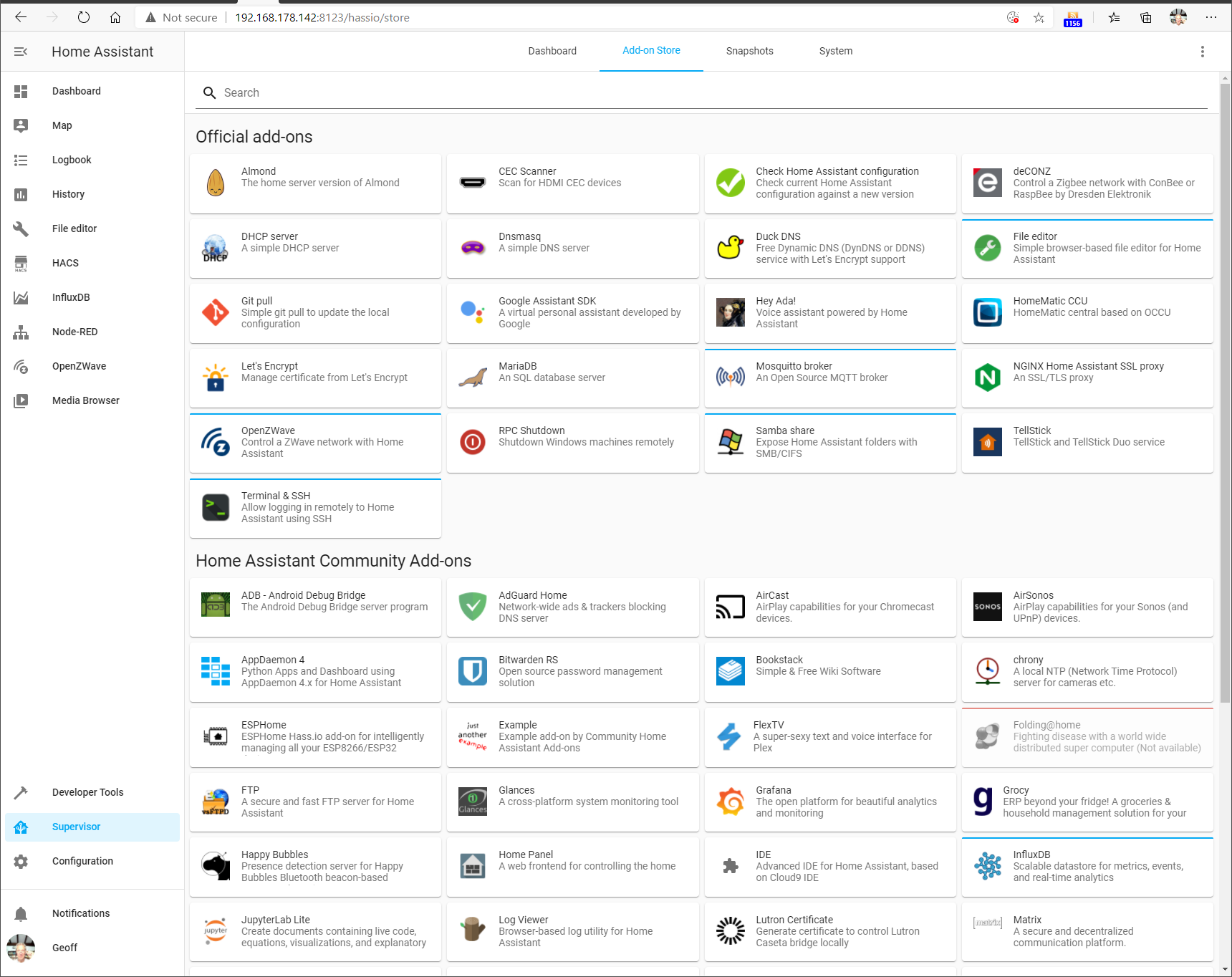 On the HA web-based interface, I clicked the Supervisor button, followed by the Add-on Store link. From the list of official add-ons, I chose the OpenZwave (beta) and the Mosquitto Broker: