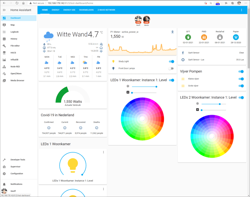 You’ll notice that besides the Z-Wave devices, there is some additional information being shown, e.g. the Weather here at our location, rubbish (garbage) collection dates, and electricity use.