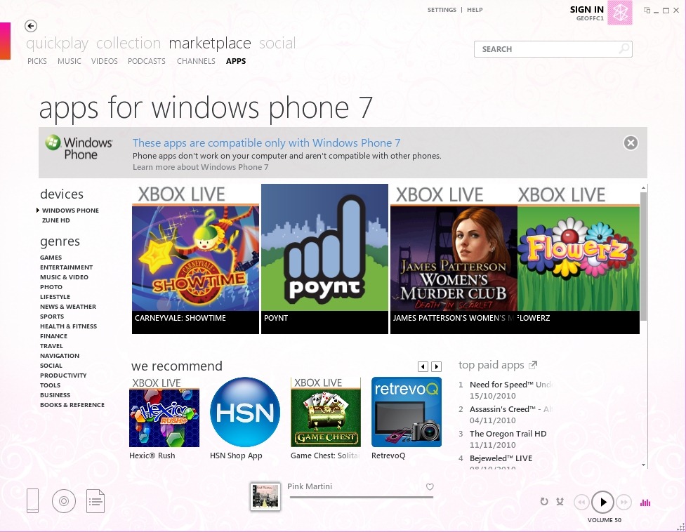 The marketplace is built on the same back-end infrastructure used by Microsoft’s Xbox Live Marketplace and the Zune Marketplace. This infrastructure is country-aware, that is, the products and services that are offered through the marketplaces may vary from country to country. Here, for example, are two screenshots of the Zune software on my PC displaying the marketplace. The first is taken with my PC with its location set to the US, while the second has the PC location set to The Netherlands.