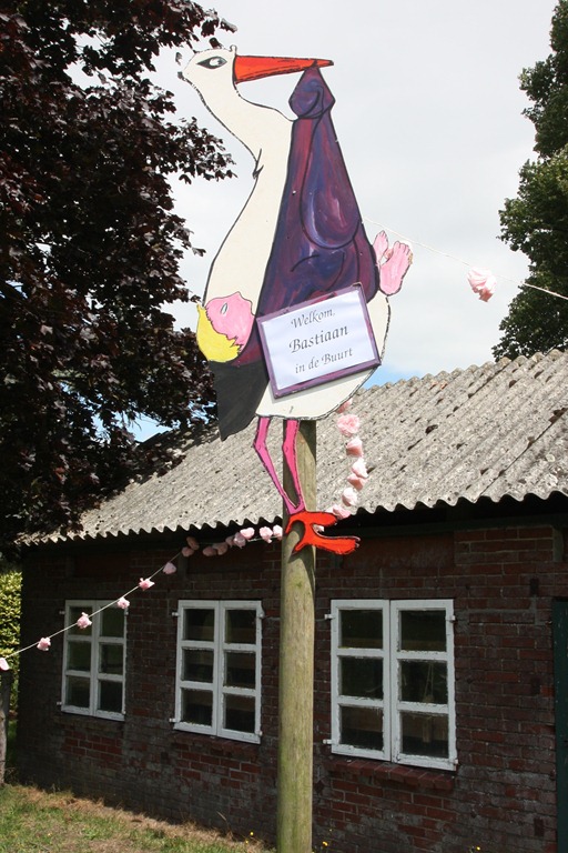 It’s become something of a tradition here in this part of the Netherlands that when a baby is born, the neighbours (the buurt) will celebrate the fact by erecting a wooden stork, festooned with clotheslines of baby clothes.
