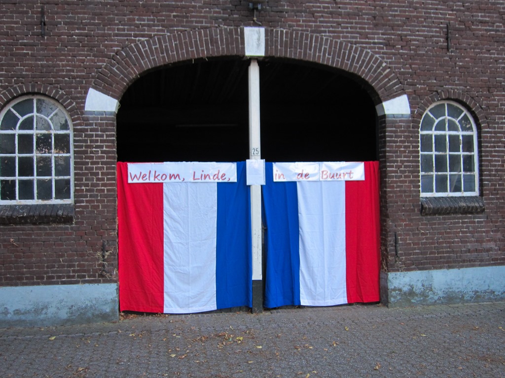 The text reads Welkom, Linde, in de Buurt (Welcome, Linde, into the Neighbourhood).