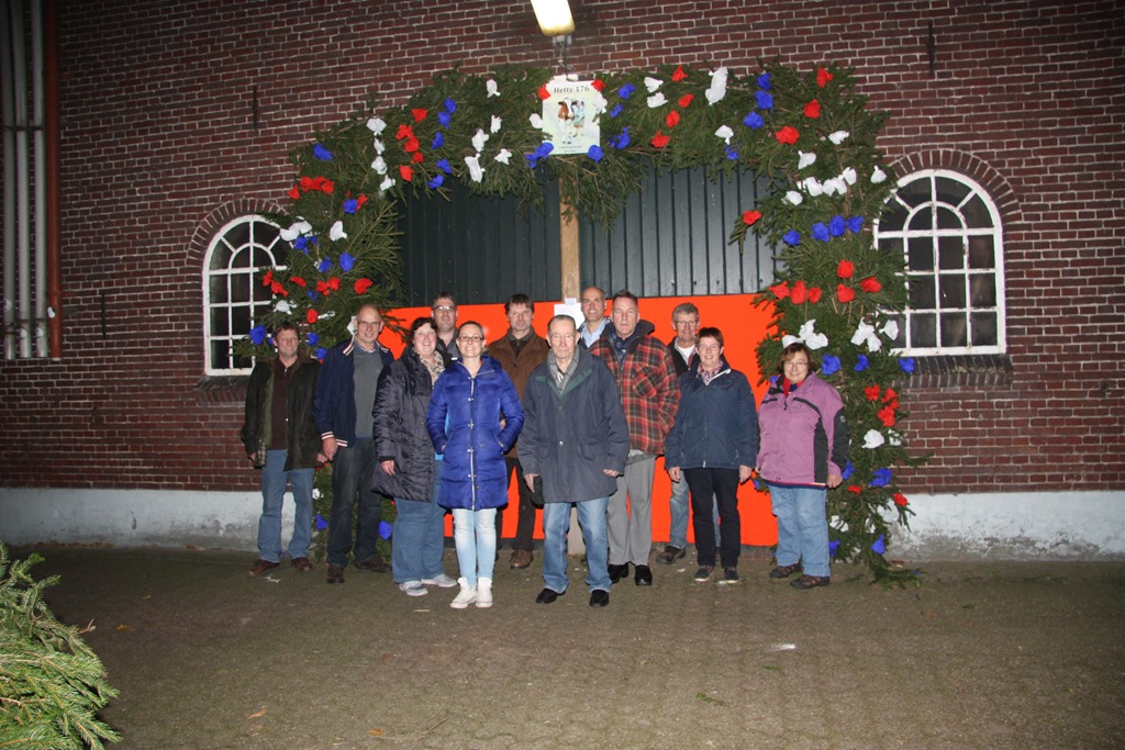 Herman is a dairy farmer, and last month one of his cows, Hetty 176, reached a milestone. In her 14 years of life, she has produced 132,000 litres of milk and 10,000 Kg of fat and protein. That, coupled with the fact that the farm has been in existence for 101 years, meant that it was clearly time for a celebration. So last Friday evening, the Buurt gathered in a neighbour’s barn, and we decorated an arch with greenery and paper flowers (red, white, and blue, the colours of the Dutch flag). Late in the evening we took the arch round to Herman and José’s and erected it in front of the entrance to their barn.