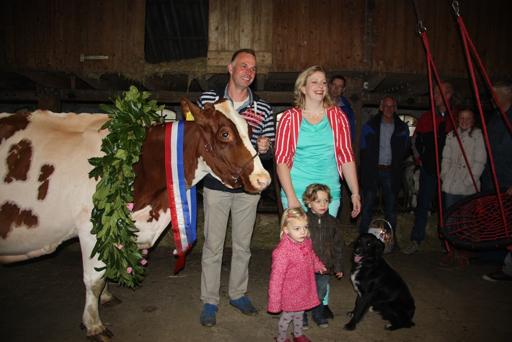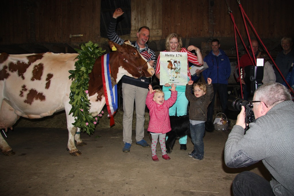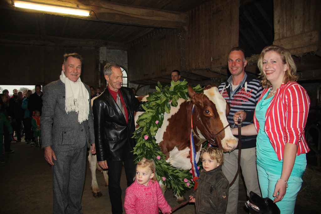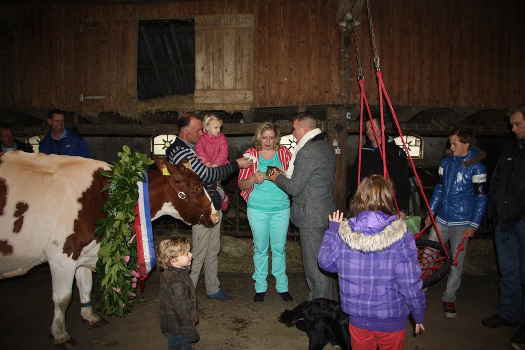 Yesterday, the Buurt, together with Herman and José’s family, friends and farming colleagues, met in the barn to celebrate Hetty’s achievement. There were representatives from CRV (a Dutch cattle herd improvement company) to present a ribbon to Hetty and a certificate to Herman. Martin and I, on behalf of the Buurt, put a laurel wreath on Hetty, and presented gifts from the Buurt to Herman and José. More speeches followed, including an emotional one from José, who reminded us that farmers do not have an easy life, and that good farmers care about their animals above and beyond the call of duty. José is very proud of Herman, and rightly so.