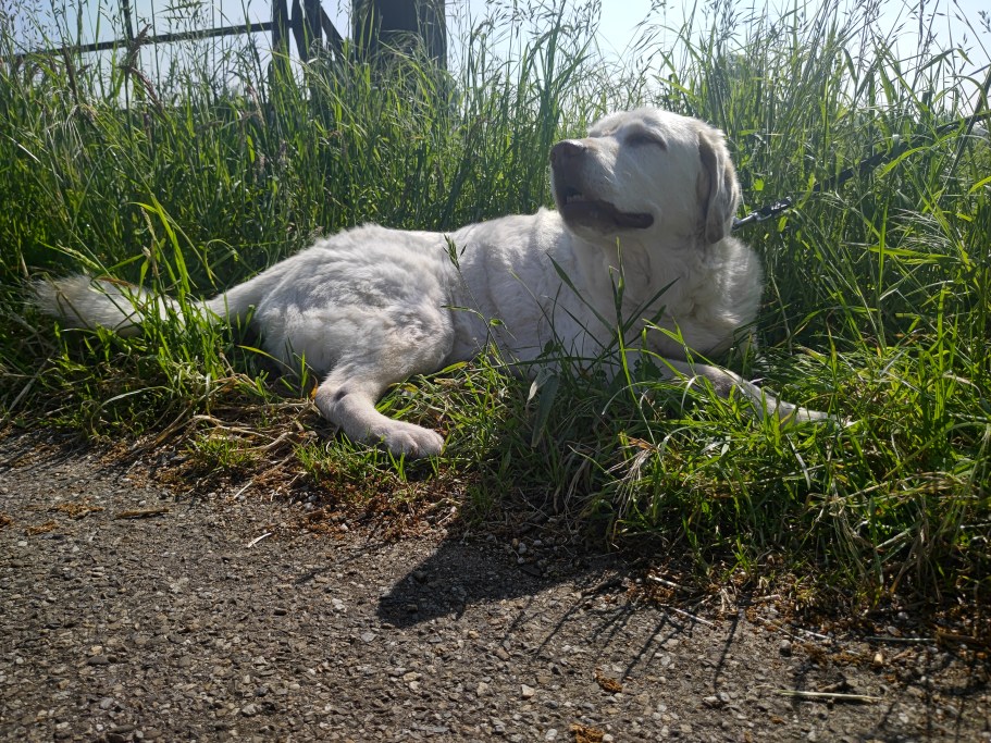 After Kai had settled in here, he had a visit from his previous owners. We were all curious to see how he would react. When they left, he followed them down to the entrance of the driveway, and then lay down, as if to say: “you can go, I’m OK here…”.