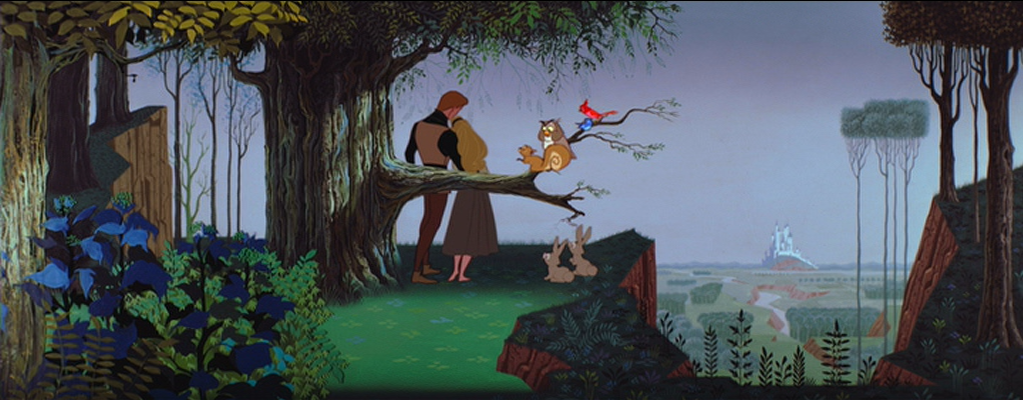 The look of the film was extraordinary. The backgrounds were styled after the illustrations in medieval Books of Hours. For Sleeping Beauty, although Disney’s regular production designer was in charge of the film’s overall look, the film’s colour stylist and chief background designer was Eyvind Earle. His work was detailed, heavily stylised, and brought a real sense of landscape into the film.