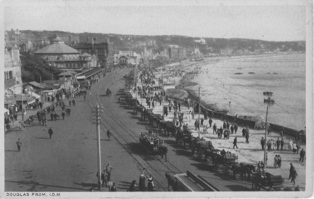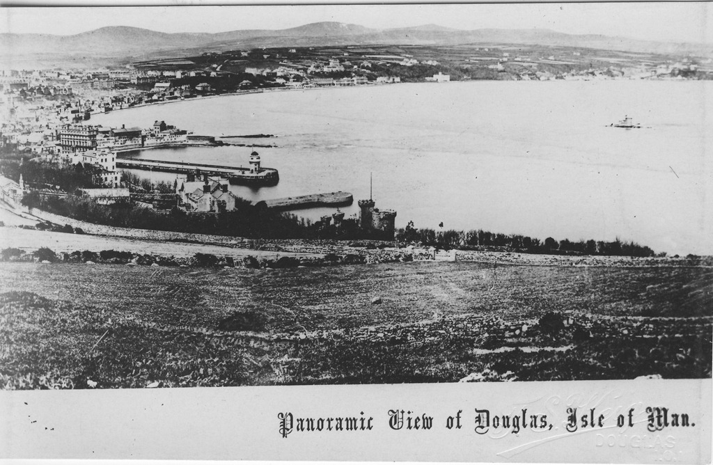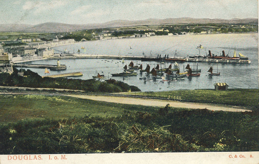 Douglas harbour has seen great changes. I couldn’t find a series of photos taken from the same viewpoint, but here are some that illustrate something of what has gone on in the last 150 years. The first shows Market Hill, the street leading up from the quay. The old St. Matthew’s church is the focus of the picture, with the old open-air market just shown on the right.