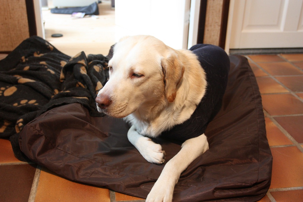 This morning he went for the chop. That was done without problem. Now he is coming to terms with the fact that something has changed. He’s feeling a bit sorry for himself, but I’m sure that will pass. He’s also being subjected to the indignity of wearing a one-piece garment at the moment in an attempt to stop him licking his wounds.