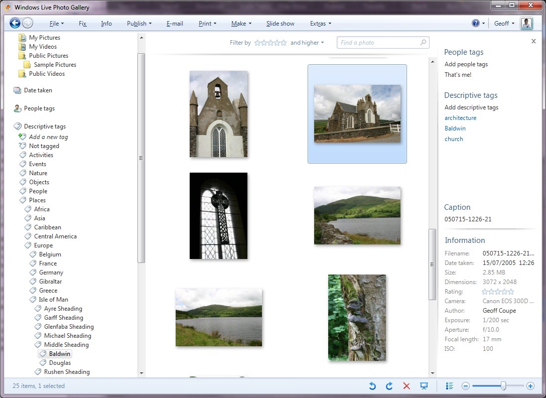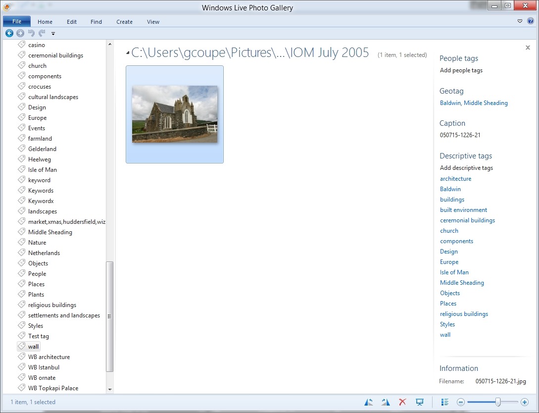 For example, here’s a screenshot of Windows Live Photo Gallery with a thumbnail photo of a church in the Isle of Man shown being selected (the light blue frame around the image).