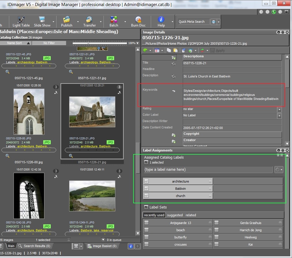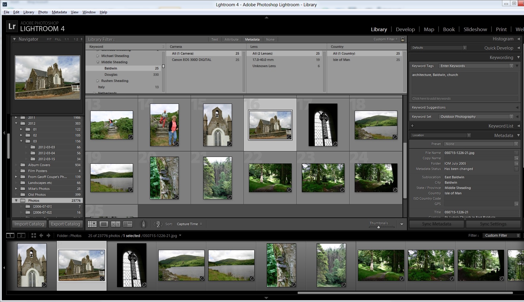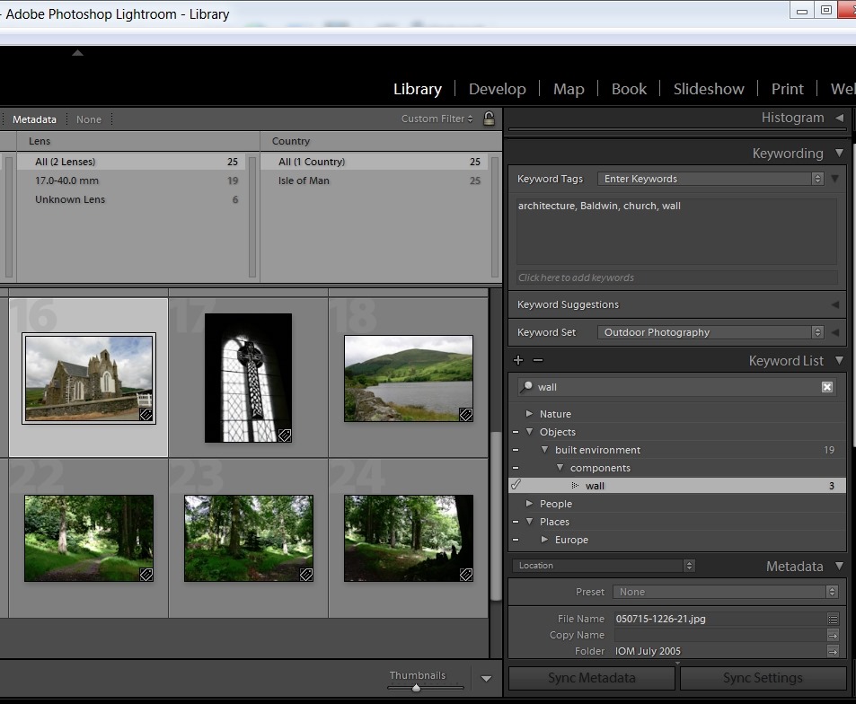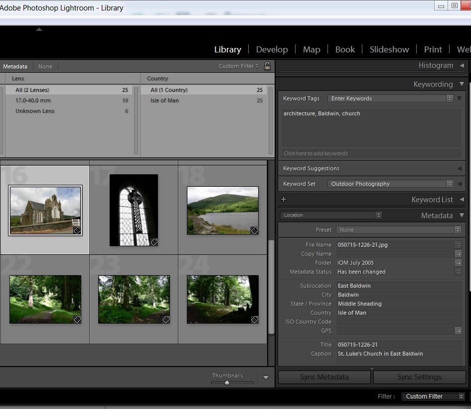 As a test, let’s use that photo of the church in Baldwin in the Isle of Man. Here you can see the current keywords assigned to it: architecture, Baldwin, church, as seen in Lightroom 4.
