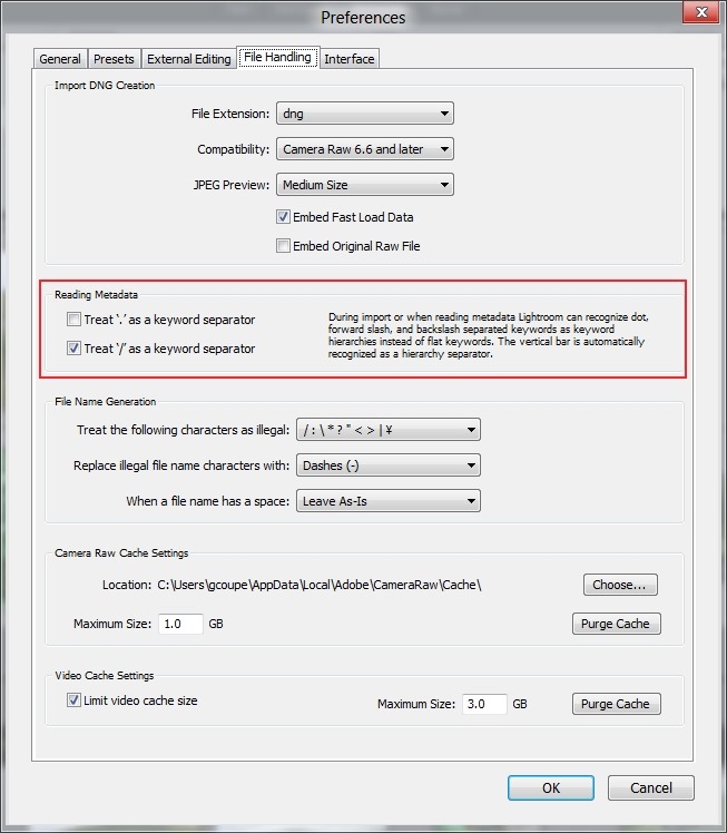 First, I discovered that although this process of recognising the separator works when importing photos into the Lightroom 4 Catalogue, it doesn’t work when reading metadata from individual photos – even though Lightroom claims it does (see the text in the “Preferences” screenshot above).