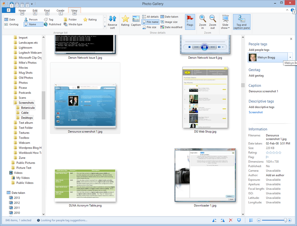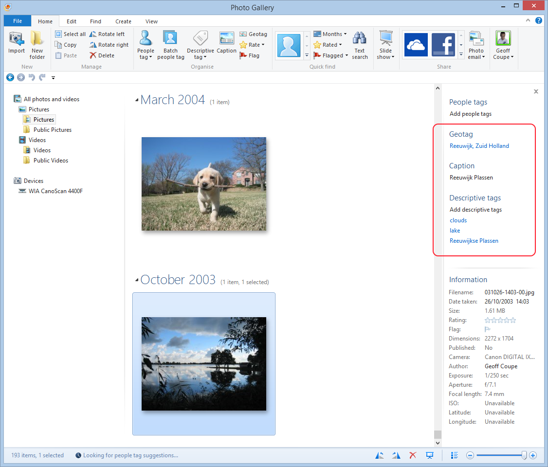 However, this photo (like all the photos I have on OneDrive) has been tagged. I can show this by downloading a copy of this photo to my PC (by clicking on the “Download” link shown at the top of the OneDrive window), and then using Microsoft’s Photo Gallery to display the metadata in its information panel: