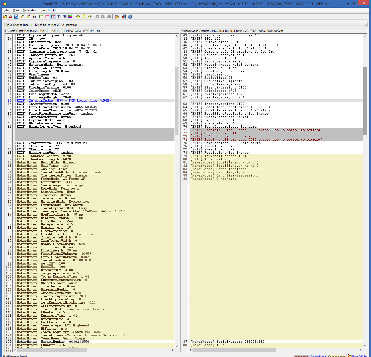 One of the complaints I have had for a long while about Microsoft’s Windows Photo Gallery (WPG) is that, in my experience, it corrupts the Makernotes metadata in images produced by my Canon cameras. That led to an interesting discussion in the comments of that blog post with Mike Lee. He said that he wasn’t seeing the metadata corruption when he used WPG. We established that we were both using the same version of WPG (build 16.4.3508.205), so then we had a mystery: why was I seeing metadata corruption, and he wasn’t? A further surprise was when he said that a sample file that I had uploaded to SkyDrive to share with him contained metadata errors, whereas I was positive that it was error-free.