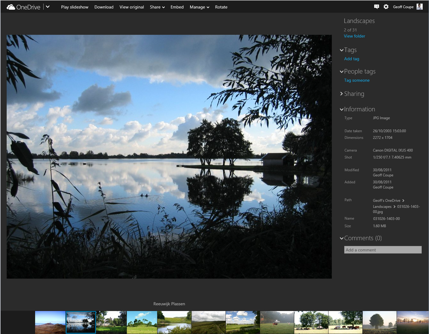 You can see that there are both Descriptive tags (clouds, lake, Reeuwijkse Plassen) and Location metadata (Reeuwijk, Zuid Holland – what Microsoft wrongly calls geotags; they are in fact more properly called geocodes) in this photo, and they were not being displayed in OneDrive.