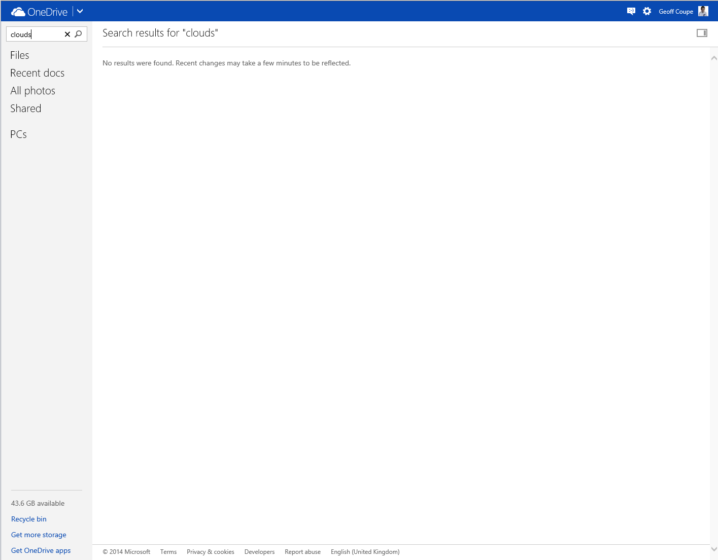 And descriptive tags are still not being searched in OneDrive. That first sample photo has a descriptive tag “clouds” in it (to be strictly correct, it has a hierarchical tag Objects/built environment/settlements and landscapes/skyscapes/clouds), but doing a search for it in OneDrive produces no results: