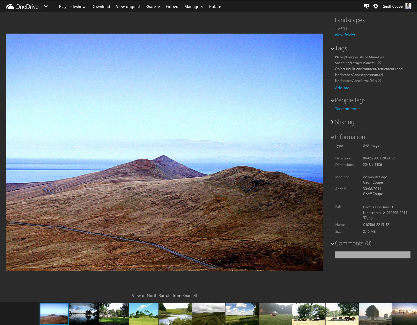 Addendum: A word of warning. Do not use the “Add tag” feature in OneDrive, if you want your photo metadata to remain consistent. Any tags added to photos using OneDrive do not get added to the metadata of the photos. You end up with a tag list displayed by OneDrive that does not reflect the tag list contained in the photo metadata.