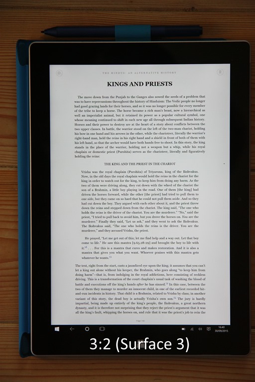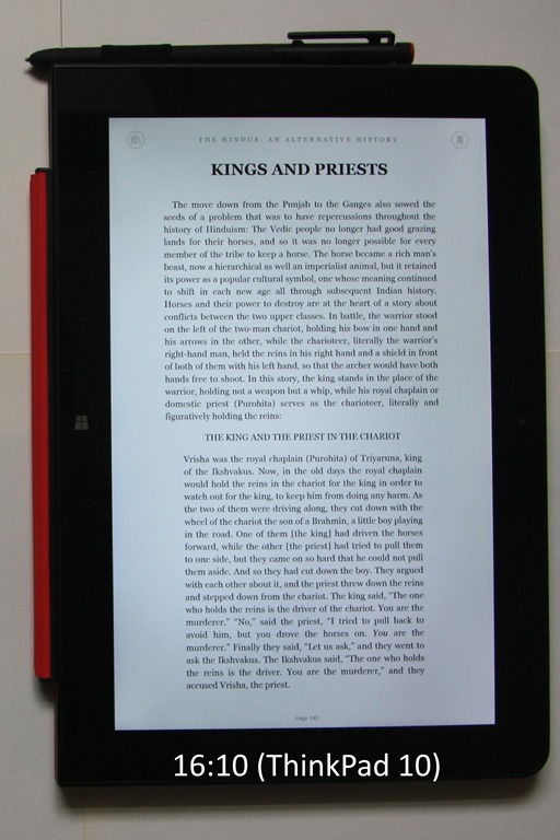 One of the frequent uses of a tablet is for reading books or magazines. And once again, the 16:9 ratio of all the current Yoga models (910, 900 or the Yoga 900s) provides (in my view) a diminished reading experience over devices with 16:10 ratios (e.g. the ThinkPad 10) or 3:2 ratios (e.g. the Surface 3 or ThinkPad X1 Tablet). Pages are rendered longer and narrower in 16:9, and the reading experience suffers as a result.