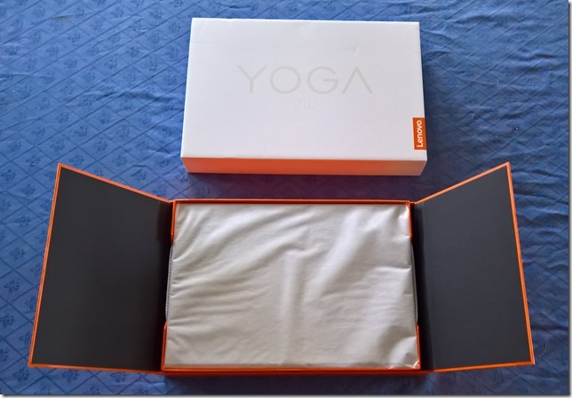 Like the boxes of the earlier Yogas, it contains a slick piece of paper engineering – after taking off the lid, you fold back the two flaps covering the top, and as you do so, the Yoga 910 (encased in its protective sleeve) rises out of the box to greet you. It’s a nice touch.