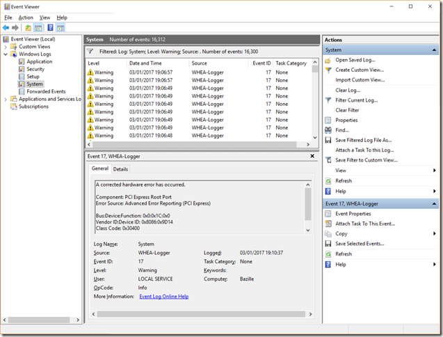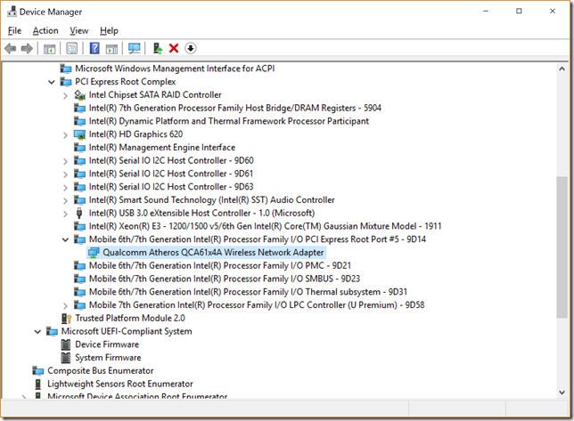 The device ID being reported as the cause of the hardware errors is given as 0x8086:0x9D14. Looking in the Device Manager, this is the PCI Express Root Port #5, which has, you’ve guessed it, the Qualcomm Atheros WLAN adaptor connected to it.